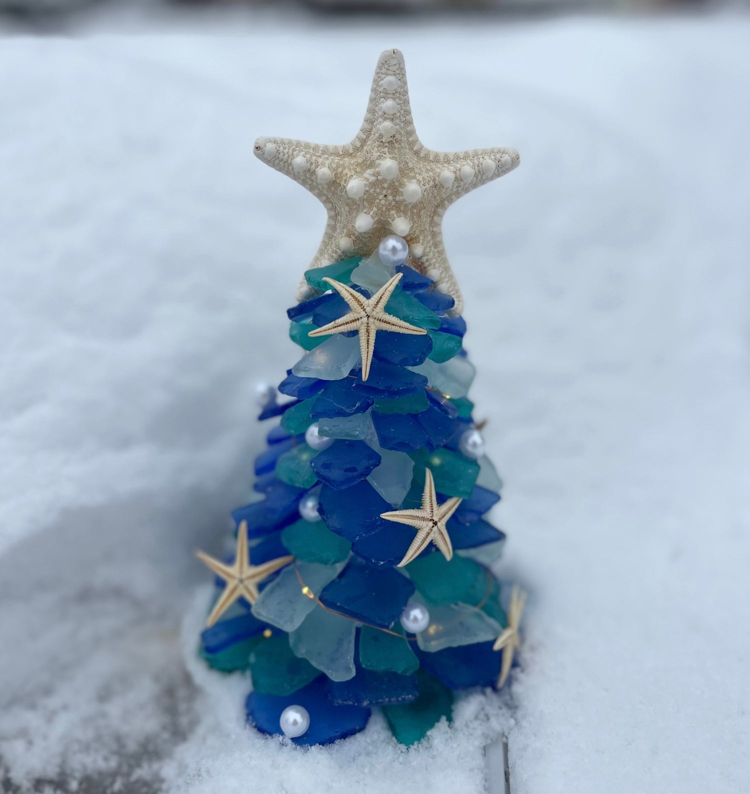 Then move to the dining room to create a custom designed 9” Sea Glass Christmas Tree taught by Raechel from Orange You Crafty. Choose between a variety of colors. Shells & battery operated lights are included.